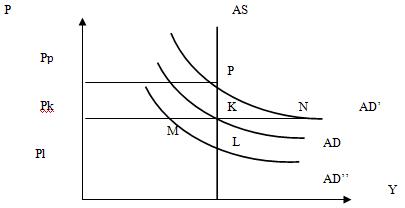 При данном уровне совокупного спроса (AD) увеличение массы денег вызовет инфляцию и приведет к смещению кривой AD вправо в положение AD’. Равновесие установится в точке Р. Увеличение денег приведет к росту AD при данном уровне цен (Рk), который будет превышать AS на величину отрезка KN. Недостаточное предложение благ вызовет рост цен, их уровень сместится вверх (с Рк до Рp) до точки нового равновесия.