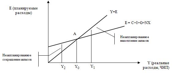 Линия планируемых расходов пересечет линию, на которой реальные и планируемые расходы равны друг другу (линию Y=E) в точке А (рис. 6.6). Этот график получил название крест Кейнса. На линии Y=E всегда соблюдается равенство планируемых и фактических инвестиций и сбережений. В точке А достигается это равенство, т.е. устанавливается макроэкономическое равновесие.