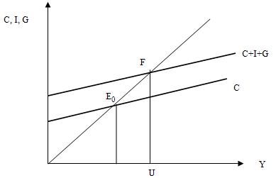 Точка Е0 на рис. 6.7 показывает такое положение равновесия национальной экономики, когда ЧНП равен потребительским расходам, а S=0, т.е. ситуация стагнирующей экономики. При добавлении частных инвестиций (Y=С+I), а затем и государственных расходов (Y=С+I+G) национальная экономика будет стремиться к состоянию полной занятости (U).
