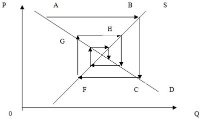 Она отражает формирование равновесия в отрасли с фиксированным циклом производства, когда производители, приняв решение о производстве на основании существовавших в предыдущий год цен, уже не могут изменить его объем: