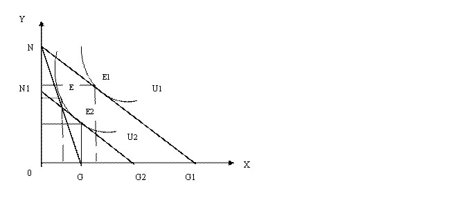 Чтобы выявить эффект дохода, необходимо провести линию бюджетного ограничения N1G2, параллельную линии бюджетного ограничения NG1, так чтобы она касалась первоначальной кривой безразличия U1. Обозначим точку касания бюджетной линии N1G2 с кривой безразличия U1 через Е2. Величина проекции отрезка кривой безразличия ЕЕ2 на ось абсцисс объясняется исключительно изменением относительных цен благ и называется эффектом замещения (субституции).