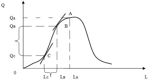 Таким образом, от точки Qc до Qв наблюдается наибольшая отдача от труда. В точке В приближаемся к максимальной отдаче, но прирост отдачи незначителен, что связано с техническими особенностями производства.