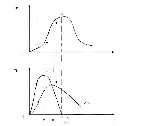 В точке В’ максимума достигает средний продукт (АР), в этой точке пересекаются кривые МР и АР, т.е. МР = АРmax.