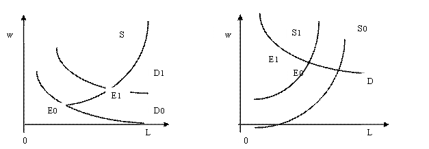 Рис.8.1. Повышение спроса на труд (а); ограничение предложения труда (б)
