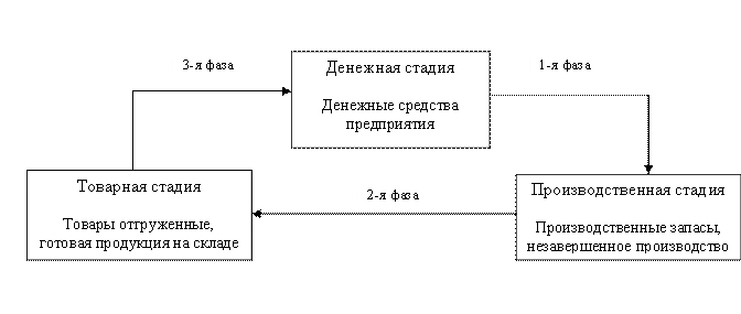 Фонды обращения связаны с обслуживанием процесса обращения товаров, они не участвуют в образовании стоимости, а являются ее носителями. После изготовления продукции и ее реализации стоимость оборотных средств возмещается в составе выручки от реализации продукции (работ, услуг). Это способствует постоянному возобновлению процесса производства, который осуществляется путем непрерывного кругооборота средств предприятия. В своем движении оборотные средства проходят три стадии: денежную, производственную и товарную.
