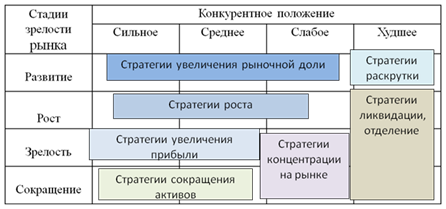 Стратегия увеличения доли на рынке состоит в значительном и постоянном увеличении доли соответствующей СЗХ, что требует инвестиций. Значительное увеличение доли на рынке обычно завершается горизонтальными слияниями или развитием уникальных конкурентных преимуществ. Цель стратегии роста - поддержание конкурентоспособности на быстро растущих рынках. Абсолютный объем инвестиций достаточно высок, но относительно отраслевого уровня он средний. Применение стратегии прибыли характерно для стадии зрелости рынка, когда конкуренция стабилизируется и темпы роста рынка замедляются. Акцент переносится с показателей роста на рентабельность, которая может быть достигнута в результате эффективного использования имеющихся активов и сегментации рынка. Стратегии концентрации рынка и сокращения активов подразумевают пересмотр размеров и уровня использования активов для быстрого увеличения массы прибыли и развития возможностей организации. Цель применения стратегий раскрутки – как можно быстрее остановить процесс снижения объема продаж. Иногда для этого могут потребоваться инвестиции капитала и ресурсов, в других случаях бизнес оказывается способным к самофинансированию. Стратегии ликвидации и отделения реализуются с целью получения денежной наличности в процессе ухода из бизнеса. Осуществление этих стратегий может предполагать продажу неиспользованного оборудования, сокращение числа клиентов с длительным сроком погашения задолженности и сокращение производства продуктов с прибылью ниже средней.
