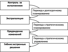 4. В условиях, когда задачи возникают настолько стремительно, что их невозможно вовремя предусмотреть, формируется управление на основе гибких экстренных решений (стратегическое управление).