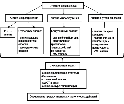 Результаты анализа внутренней и внешней среды позволяют провести ситуационный анализ компании, который будет являться основой для выбора стратегии (рис. 4.2). В последующих разделах будут рассмотрены методы стратегического анализа, исходя из логики, предложенной на рис. 4.2.