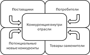 Анализ проводится для идентификации благоприятных возможностей и опасностей, с которыми может столкнуться компания в отрасли. М. Портер предложил модель «пяти сил», которая аргументирована тем, что чем выше давление со стороны выделенных факторов, тем меньше у компании возможности увеличивать прибыль. Компания, изменив свою стратегию, может воздействовать на эти силы в свою пользу. Пять сил представлены на рис. 6.1.