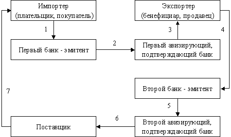 После открытия основного аккредитива (1) банк-эмитент извещает об этом банк продавца (2). Этот банк, выступая как авизующий и, как правило, подтверждающий банк, извещает продавца об открытии аккредитива (3). Продавец обращается в банк с заявлением об открытии на основе базисного аккредитива, встречного аккредитива в пользу производителя товара или субпоставщика (4). Второй банк-эмитент открывает аккредитив и извещает об этом банк, обслуживающий производителя товаров (5), а банк извещает поставщика (6). Поставщик отгружает товар покупателю (7) и представляет в банк документы, предусмотренные условиями аккредитива.