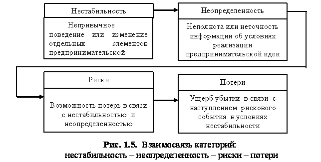 Природа нестабильности, неопределенности, рисков и потерь (Рис. 1.5) при осуществлении предпринимательской деятельности связана с финансовыми убытками предпринимателя.