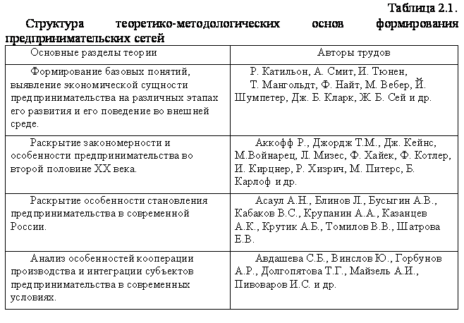 Формирование предпринимательских сетей связано с интеграционным поведением субъектов системы предпринимательства. Эти процессы базируются, прежде всего, на теоретическом осмыслении сущности предпринимательской деятельности и на изучении и понимании ее особенностей в меняющихся условиях внешней среды. Структура научно – методических работ, послуживших теоретической основой исследуемой проблемы, приводится в табл.2.1.