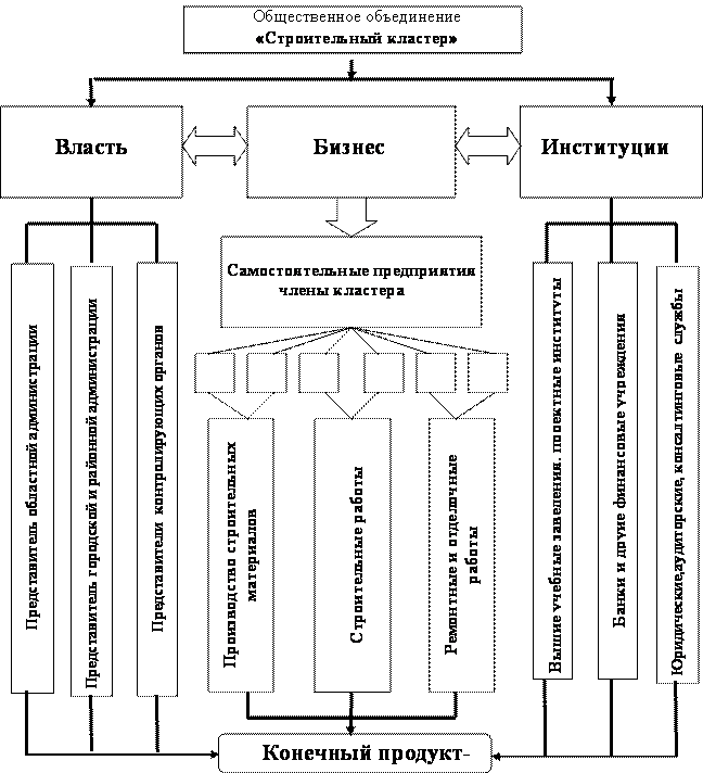 Характерной особенностью кластеров, несмотря на масштабы их образований или отраслевую принадлежность, является их направленность на создание и производство конкурентоспособной продукции, работ или услуг которая может быть экспортирована за границу, или по крайней мере за пределы региона. Как правило, кластеру не присуща ориентация на внутреннего потребителя. Создание строительного или жилищно-коммунального кластера – это особая форма кластерной модели, поскольку и строительство и жилищно-коммунальное хозяйство это вид деятельности, ориентированный прежде всего на внутренний рынок и основной продукцией которой является строительство и обслуживание современного комфортного жилья[120].
