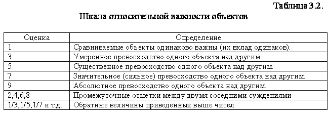 Шкала относительной важности объектов (элементов, факторов и т.д.), разработанная Саати, имеет следующие значения: