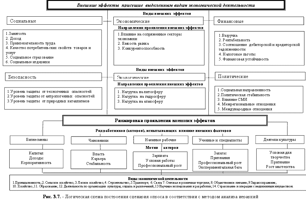 При формировании схемы построения сценария оценки внешней эффективности видов экономической деятельности субъектов предпринимательства определены виды внешних эффектов, сферы (направления) их проявления, ряд общих групп работников, на которых так или иначе влияют внешние эффекты, и, наконец, выделено 14 типовых видов экономической деятельности региона, в том числе: промышленность, сельское хозяйство, лесное хозяйство, строительство, транспорт, связь, оптовая и розничная торговля, общественное питание, здравоохранение, городское хозяйство, образование, деятельность по организации культуры, отдыха и развлечений, научные исследования и разработки, страхование и операции с недвижимым имуществом. Для каждой группы работников определены их основные мотивы деятельности и функциональные установки.