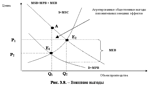 Между тем, предельные социальные выгоды больше предельных частных выгод на величину предельных внешних выгод. Поэтому эффективное для общества равновесие достигалось бы в точке пересечения предельных социальных выгод и издержек, то есть в точке Е2. Эффективность увеличивается на площадь треугольника AE1E2. Таким образом, при наличии положительного внешнего эффекта экономическое благо продается и покупается в меньшем по сравнению с эффективным объеме.