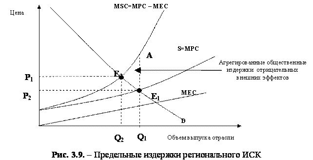 Как можно видеть на рис. 3.9, при внешних издержках, вызываемых отрицательными внешними издержками, рыночное равновесие, если оно установиться в точке Е, при объеме Q1 выпуска продукции по цене Р1, не является Парето-эффективным. Поскольку субъекты предпринимательской деятельности несут только часть реальных затрат, в точке Е1, в которой предложение, равное предельным частным издержкам MPC имеет место перепроизводства блага. Если бы все затраты включить в цену, то Парето-эффективное рыночное равновесие будет в точке Е2 пересечения кривой спроса D с кривой предельных общественных выгод MSB. При этом предельные социальные издержки равны сумме предельных частных издержек плюс предельные внешние издержки. Следовательно, если превратить внешние издержки во внутренние, эффективный объем выпуска сократиться до Q2 при росте цены до P2. В точке Е2 предельные общественные выгоды равны предельным общественным издержкам MSB=MSC.