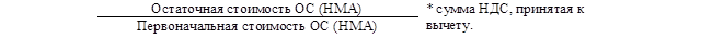 Восстановлению подлежат суммы НДС, принятые ранее к вычету по поступившим ОС и НМА, пропорционально остаточной стоимости имущества без учета переоценки. При этом применяется следующая формула: