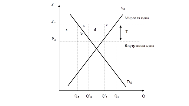 Если внутренняя цена равна мировой (Pw), то объем экспорта составляет (Qs - Qd). Введение таможенной пошлины делает экспорт сахара менее прибыльным, поэтому производители увеличивают продажи на внутреннем рынке. Это приводит к снижению внутренней цены на величину тарифа до Pd. Снижение внутренней цены стимулирует возрастание внутреннего потребления сахара с Qd до Qd', но одновременно отечественные производители сокращают объемы производства с Qs до Qs'. Сокращаются и объемы экспорта до величины (Q’s – Qd).