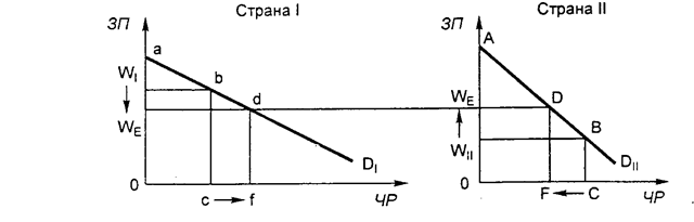 Рабочие из страны II будут эмигрировать в страну I, пока заработная плата не установится на одинаковом уровне WE. До того, как установится это равновесие, FС(= fс) миллионов рабочих эмигрируют из страны II в страну I. Средний уровень заработной платы в стране I упадет с WI, до WII. Объем же национального продукта в этой стране увеличится с 0abc до 0adf. В стране II, напротив, средний уровень зарплаты повысится с WII до WE, а объем национального продукта уменьшится с 0АВС до 0АDF.