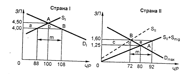 При данных условиях рабочие из страны II будут эмигрировать в страну I до тех пор, пока заработная плата в двух странах не установится на одинаковом уровне. Простая экономическая схема миграции представлена на рис.8.1.