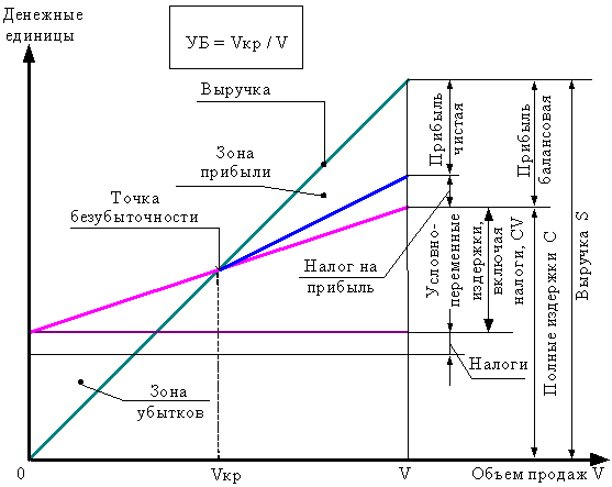 Точка безубыточности Vкрm определяется по
