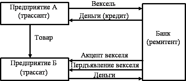 Пример. Предприятие А получает кредит в банке для производства продукции, потребителем которой является предприятие Б. Отношения трех сторон оформляются переводным векселем.