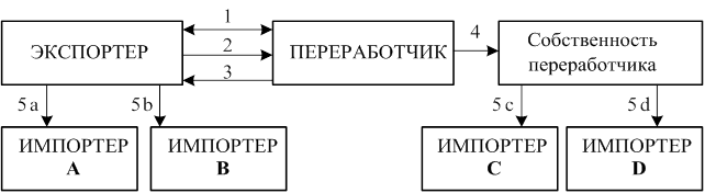 Условные обозначения: 1 – заключение контракта экспортером (поставщиком) с переработчиком о производстве продукции из давальческого сырья; 2 – транспортировка ягод в Финляндию; 3 – возвращение части готовой продукции экспортеру; 4 – переход части изготовленной из давальческого сырья продукции в собственность переработчика; 5а, 5Ь – продажа имеющейся у экспортера продукции на внешнем рынке импортеров А и Б; 5с, 5d – продажа переработчиком части продукции импортерам С и D.