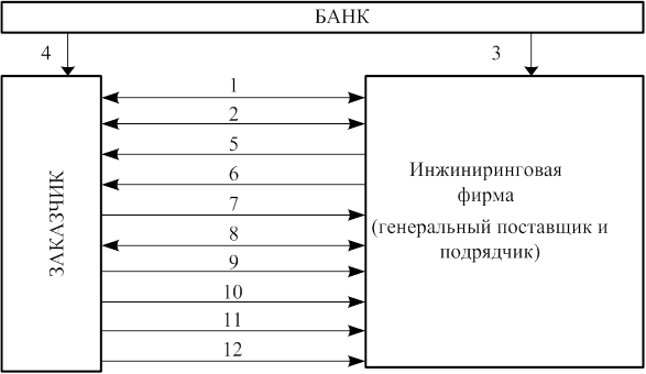 Условные обозначения: 1 – изучение конъюнктуры рынка заказчиком и инжиниринговой фирмой по поводу размещения заказа (исполнения работ); 2 – заключение контракта на выполнение инжиниринговых услуг; 3 – получение кредитов в банке инжиниринговой компанией; 4 – получение кредитов заказчиком; 5 – разработка технико-экономического обоснования; 6 – разработка техно-рабочего проекта; 7 – контроль хода работы; 8 – обучение персонала и изготовление первой партии товара; 9 – сдача объекта; 10– оплата за выполнение работы по контракту; 11 – оказание услуг по реализации производственной структуры; 12 – совершенствование управления.