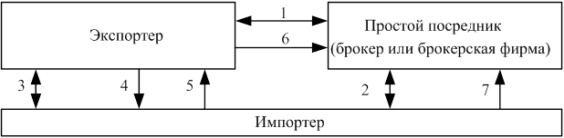 Условные обозначения: 1 – заключение экспортером договоров-поручений с простым посредником на оказание услуг по продаже товаров; 2 – заключение импортером договоров с простым посредником на оказание услуг по закупке товаров; 3 – заключение контрактов между экспортерами и импортерами на поставки или закупку товаров с использованием услуг простого посредника; 4 – поставка товаров импортеру; 5 – оплата за поставленный товар; 6 – вознаграждение экспортером простого посредника в случае оказания ему услуг; 7 – вознаграждение импортером простого посредника в случае оказания ему услуг.