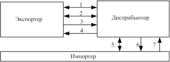 Условные обозначения: 1 – соглашение о праве продажи товаров экспортера; 2 – заключение контракта купли-продажи конкретной партии товаров; 3 – поставка товаров дистрибьютору; 4 – расчетно-платежные операции дистрибьютора с экспортером; 5 – договор поставки товаров импортеру; 6 – поставка товаров импортеру; 7 – оплата за товар дистрибьютору.