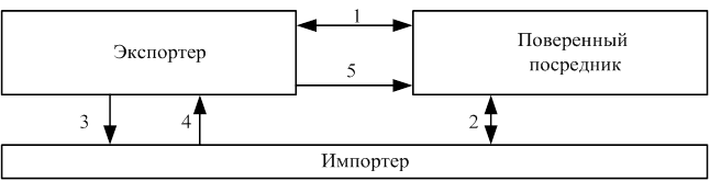 Условные обозначения: 1 – заключение договора коммерческого представительства; 2 – заключение контракта поверенным посредником с импортером на поставку товаров; 3 – поставка товаров экспортером; 4 – оплата импортером за поставленные товары; 5 – вознаграждение поверенного посредника за оказанные им услуги экспортеру.