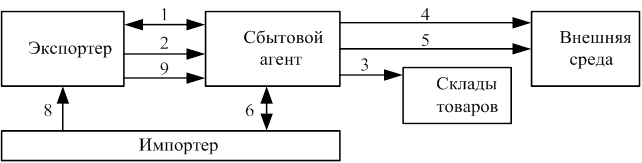 Условные обозначения: 1 – агентское соглашение экспортера со сбытовым агентом по вопросам сбыта товаров за рубежом; 2 – поставка товаров сбытовому агенту; 3 – размещение товаров на складах, где осуществляется их хранение, предпродажный сервис и техническое обслуживание; 4 – исследование рынков сбыта; 5 – реклама товаров; 6 – заключение контрактов с импортерами по поставке им товаров; 7 – поставка товаров импортерам; 8 – оплата импортером закупленных товаров; 9 – вознаграждение экспортером агентского соглашения за сбыт товаров.