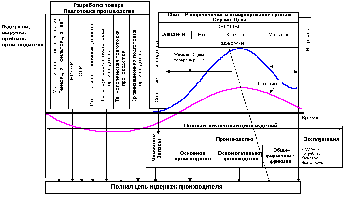 На рис.3 приведен "финансовый профиль" проекта создания, освоения и производства нового изделия (жизненные циклы изделия и товара) в рамках многопродуктовой корпорации. Для инновационной фирмы товаром будет являться документация на изделие, лицензия на ее производство и сбыт, "ноу-хау". Финансирование НИОКР может осуществляться за счет кредитов, собственной прибыли, а также по договорам с заказчиками.