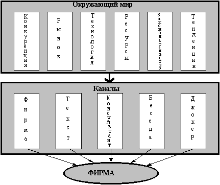 По каналу “Текст” фирма получает 30 - 40% информации. Канал “Фирма” появляется в результате контактов персонала фирмы со всеми партнерами - это еще 30 - 40% информации. Канал “Консультант” обеспечивает примерно 10 - 15% информации. Через канал “Беседа” проходит 5 - 6% информации. Кроме того, информация может быть получена фирмой случайно (канал “Джокер”).