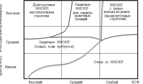 4. Фирма в своей деятельности может использовать наступательную стратегию НИОКР (разработка новых продуктов и технологий), защитную стратегию (улучшение продуктов и технологий), смешанную стратегию, а также лицензирование. Выбор стратегии зависит от рыночного положения фирмы, ее конкурентного статуса, стадии жизненного цикла отрасли и характера портфеля СЗХ (для диверсифицированной фирмы).