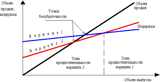 При определенных обстоятельствах для крупных проектов стоимость разработки может выступать в качестве решающего фактора. В таких случаях требуются более точные оценки, и, следовательно, необходимо сосредоточить усилия на получении необходимой информации. Рассмотрим несколько конкретных ситуаций. Для определенного круга сложных технических изделий характерны высокий уровень затрат на НИОКР и небольшое количество изделий на стадии производства. В этом случае может оказаться желательным уменьшение общих затрат на НИОКР за счет некоторого понижения технического уровня изделий ("лучшее - враг хорошего"). Однако подобное снижение затрат на НИОКР может привести к увеличению удельных издержек производства. Ситуация иллюстрируется рис.15, где вариант 1 - высокие затраты на НИОКР, низкие удельные производственные издержки; вариант 2 - сниженные затраты на НИОКР и более высокие удельные производственные расходы. Очевидно, что при сравнительно небольших объемах выпуска выгоднее вариант 2 финансовой политики.