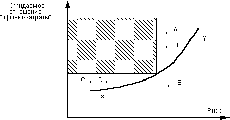 Результаты анализа риска можно использовать для сравнения степеней предпочтительности проектов, например, с помощью диаграммы «Ожидаемое отношение "эффект-затраты" - ожидаемый риск» (рис. 16).