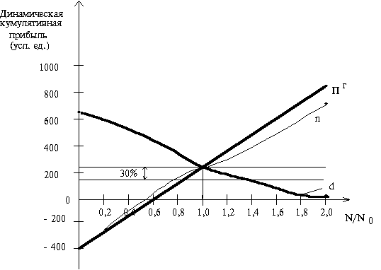 Как следует из рис. 17, при выходе параметров (годовая прибыль, учетная ставка, число лет производства) за определенные пределы проект теряет свою экономическую привлекательность. Если фирма считает допустимым снижение дисконтированной кумулятивной прибыли не более чем на 30%, то соответствующими границами опасного изменения параметров будут: для Пг 0,8 от номинала (N/N0=1), для d 1,4 от номинала, для n 0,8 от номинала.