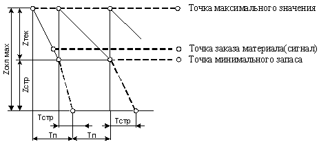 Страховым запасом Zстр называется часть складского запаса материала, предназначенная для обеспечения производства в случае отсутствия текущего значения, а также непредвиденных отклонений от нормальных условий снабжения