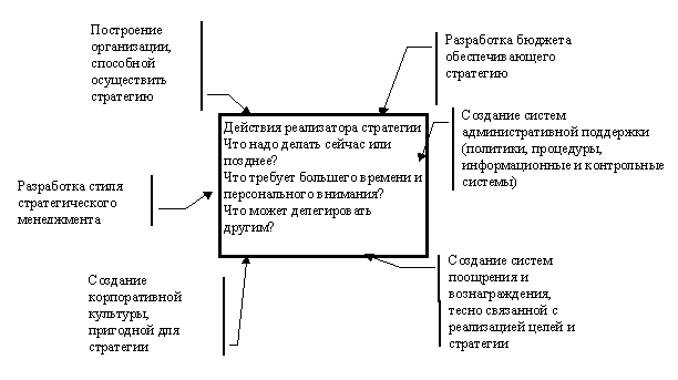 Когда стратегический план разработан перед менеджером стоит задача превратить его в действия и хорошие результаты. Если разработка стратегии прежде всего предпринимательская деятельность, то ее реализация - внутренняя административная деятельность. Детали такой деятельности зависят от конкретной ситуации. Однако имеются повторяющиеся ключевые задачи этого процесса (рис.18).