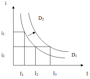 График показывает инвестиционный спрос, который находится в обратно пропорциональной зависимости между объемом инвестиций и ставкой процента. Снижение процента до i2 вызывает увеличение производимых вложений до уровня I2.