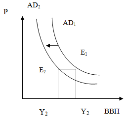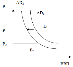 Равновесие на кейнсианском отрезке AS. Если кривая спроса сдвигается влево, то выпуск продукции падает. Снижение совокупного спроса (от AD1 к AD2) приведет к уменьшению реальных объемов производства (от Y1 к Y2 ).