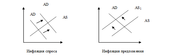 Различают инфляцию спроса и инфляцию предложения (издержки). Первая – есть результат избыточного совокупного спроса при полной занятости, вторая – следствие роста средних издержек на единицу и снижение совокупного предложения вследствие избыточного роста номинальной заработной платы по сравнению с производительностью труда, роста цен на сырье, увеличение налогов.