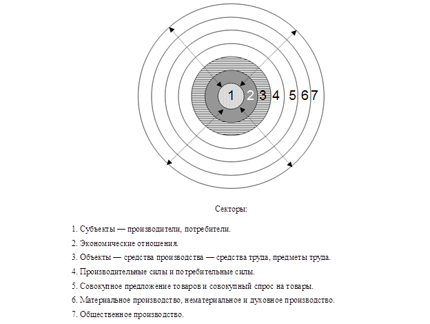 На рисунке 2 видно, что ядром целостности существования общественного производства являются первые три сектора, где расположены следующие элементы: субъекты, экономические отношения и объекты — средства производства. В то же время общественное производство обусловливает их развитие. Общественное производство как определенная целостность воздействует на свои элементы и части (секторы 1, 2, 3, 4, 5, 6) посредством экономических отношений.