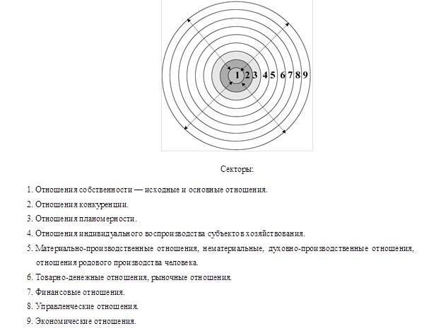 Таким образом, субординация связи частей (секторов), выражающих различные виды отношений, представляют структуру экономических отношений, а состояние ее функционирования характеризует систему. В системе экономических отношений собственность, как исходное и основное отношение, обусловливает развитие отношений конкуренции, планомерности, отношение индивидуального воспроизводства, где они предопределяют функционирование материально-производственных отношений, духовно-производственных отношений, отношений родового производства человека, товарно-денежных отношений, финансовых отношений, управленческих отношений. Вышеприведенные отношения в реалии проявляются весьма запутанным образом и функционируют в рамках экономических законов, формируя содержание рыночного механизма.