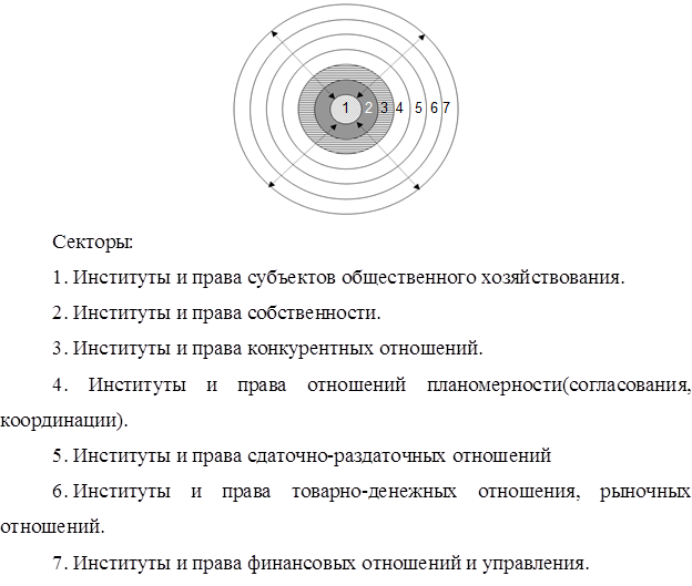 Базовыми институтами являются институты субъектов общественного хозяйствования, поскольку сами субъекты производители и потребители, и экономические отношения относятся к ядру экономики, модели структуры общественного производства[5, с.69]. Если исходить из модели экономических отношений[5, с.79], то институты и права собственности становятся основой правовой системы, к которым относятся институты общественной(государственной) собственности; институты частной собственности, институты индивидуальной и личной собственности; система (пучок) прав собственности. Данное ядро правовой системы вытекает из основ экономики и экономических отношения. Затем должны следовать институты конкуренции и планомерности(согласования), правовые механизмы сдаточно-раздаточных и рыночных отношений, и так далее.