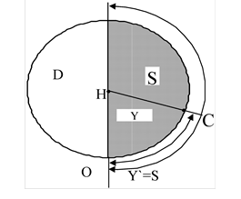 В совокупной стоимости товаров спрос и предложение равновесны и равновелики, то есть D = S. Предложение товаров равно общественно необходимой величине валового общественного продукта: S = Y`. На рисунке 19 занимаемая площадь Y` составляет заштрихованную половину окружности. Y` выражает совокупный спрос денег в масштабе макроэкономики, тогда как выпуск или валовой общественный продукт (Y), занимающий площадь ОНС в окружности, представляет удовлетворенный спрос денег. Разницей между совокупным спросом и удовлетворенным спросом денег определяется неудовлетворенный спрос товаров, который равен по величине предложению денег и представляет на рисунке площадь РСН.