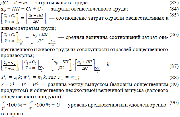Выпуск или валовой общественный продукт (SW) дает возможность видеть весь объем использования ресурсов с учетом кругооборотов за текущий год в стоимостном выражении. Далее, сопоставление в выпуске (валовом общественном продукте, SW) частей С:(V + m) позволяет определить эффективность добавленной стоимости. А определение общего коэффициента эффективной добавленной стоимости (kд) позволяет вычислить коэффициент приведения индивидуальных затрат труда к общественно необходимым (kс). Он даст возможность определить общественно необходимые величины затрат труда конкретных отраслей: