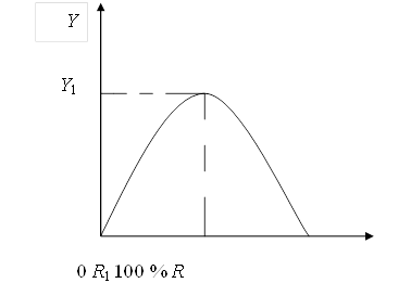 На рисунке 27 по оси абсцисс (горизонтальной линии) отложены налоговые ставки (R), а ординат (вертикальной линии) — поступления в государственный бюджет (Y). Увеличение налоговых ставок до пересечения двух прямых координат R1 и Y1 позволяет расти доходу в государственный бюджет, затем дальнейший рост R будет снижать бюджетные поступления. Здесь оптимальным вариантом является ставка налога R1, позволяющая обеспечить максимальные поступления доходов в государственный бюджет.